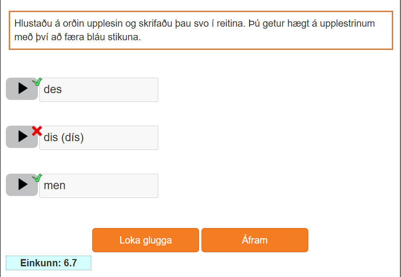 Nemendur hlusta á nokkur orð lesin upp og rita þau svo niður. Þannig fá þeir þjálfun í að greina íslensku málhljóðin.
